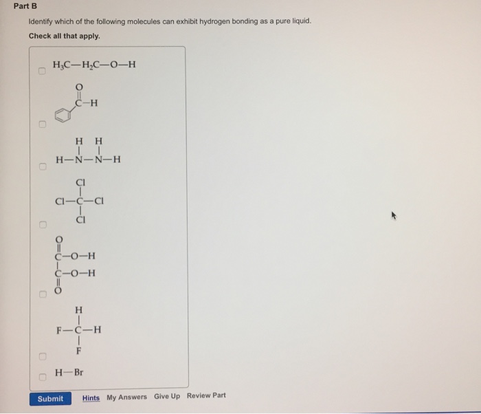 Check all that apply. View available hint (s) | hint 1. How to approach the problem hint 2. A liquid can be converted to a gas by cooling. The ch4 molecule exhibits hydrogen bonding. Identify which of the following molecules can exhibit hydrogen bonding as a pure liquid. *n2h4 cf2h2 hcl cf4 *h3co2h *c2h2o4 h2c2oh. The hydrides of group 5a are nh3, ph3, ash3, and sbh3. Arrange them from highest to lowest boiling point.